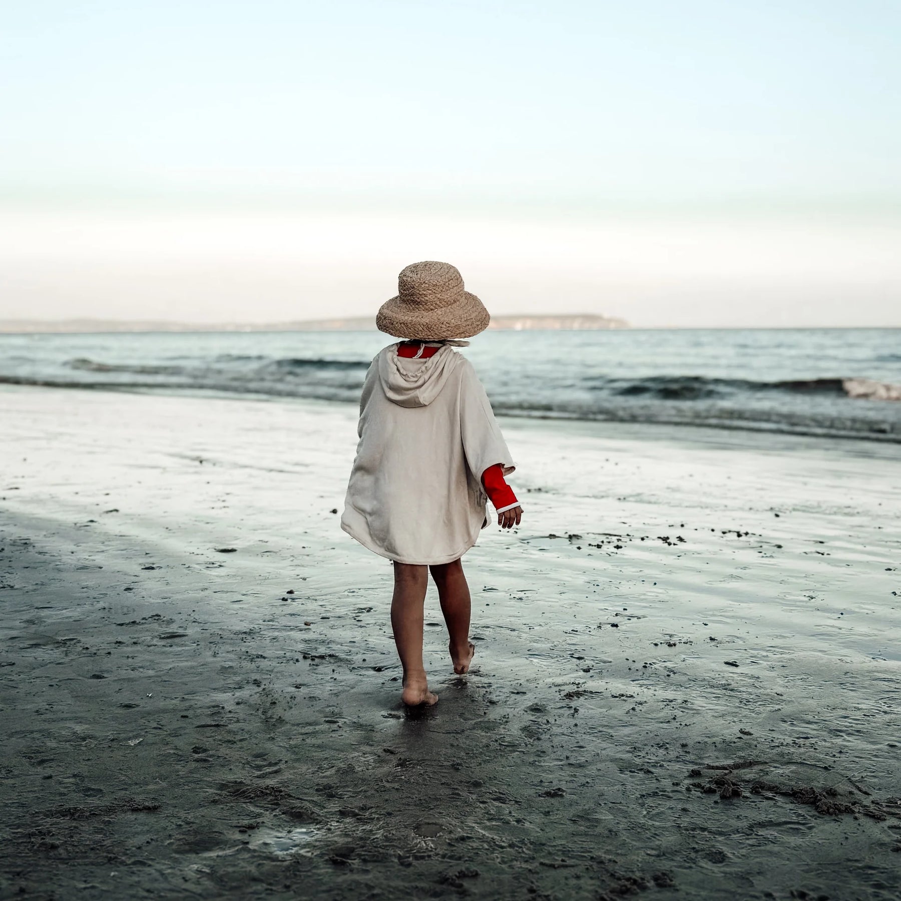 Kid by the beach wearing Cosy Roots Organic UV Poncho - Sand
