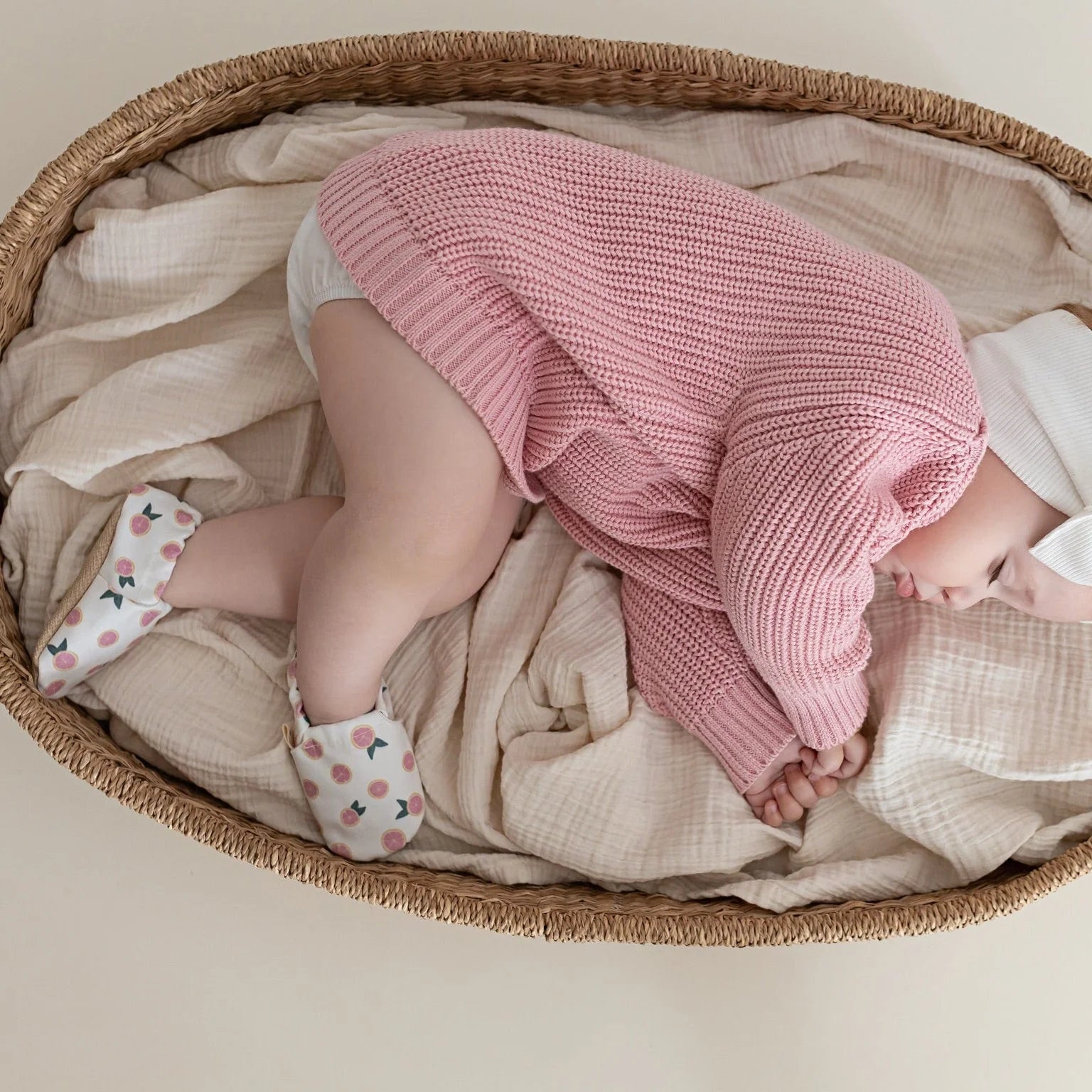 Baby wearing Cosy Roots Vegan Shoes - Little Grapefruits