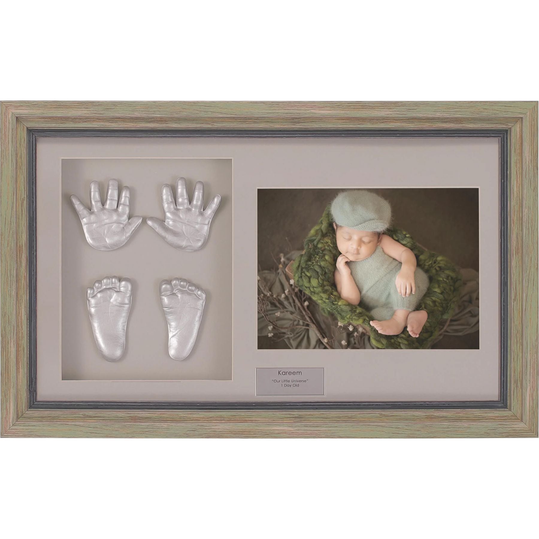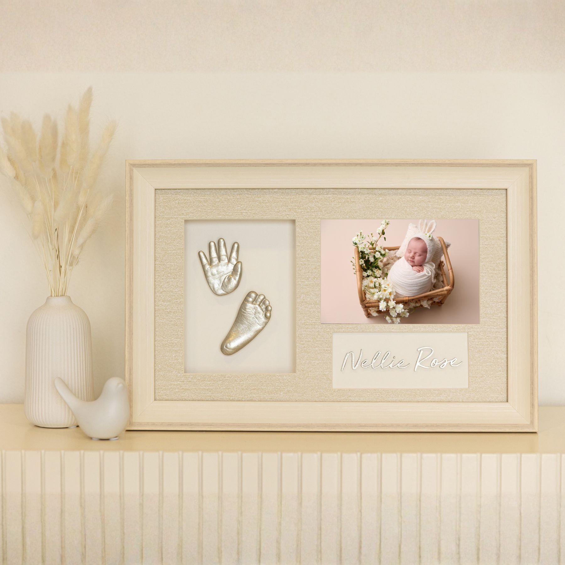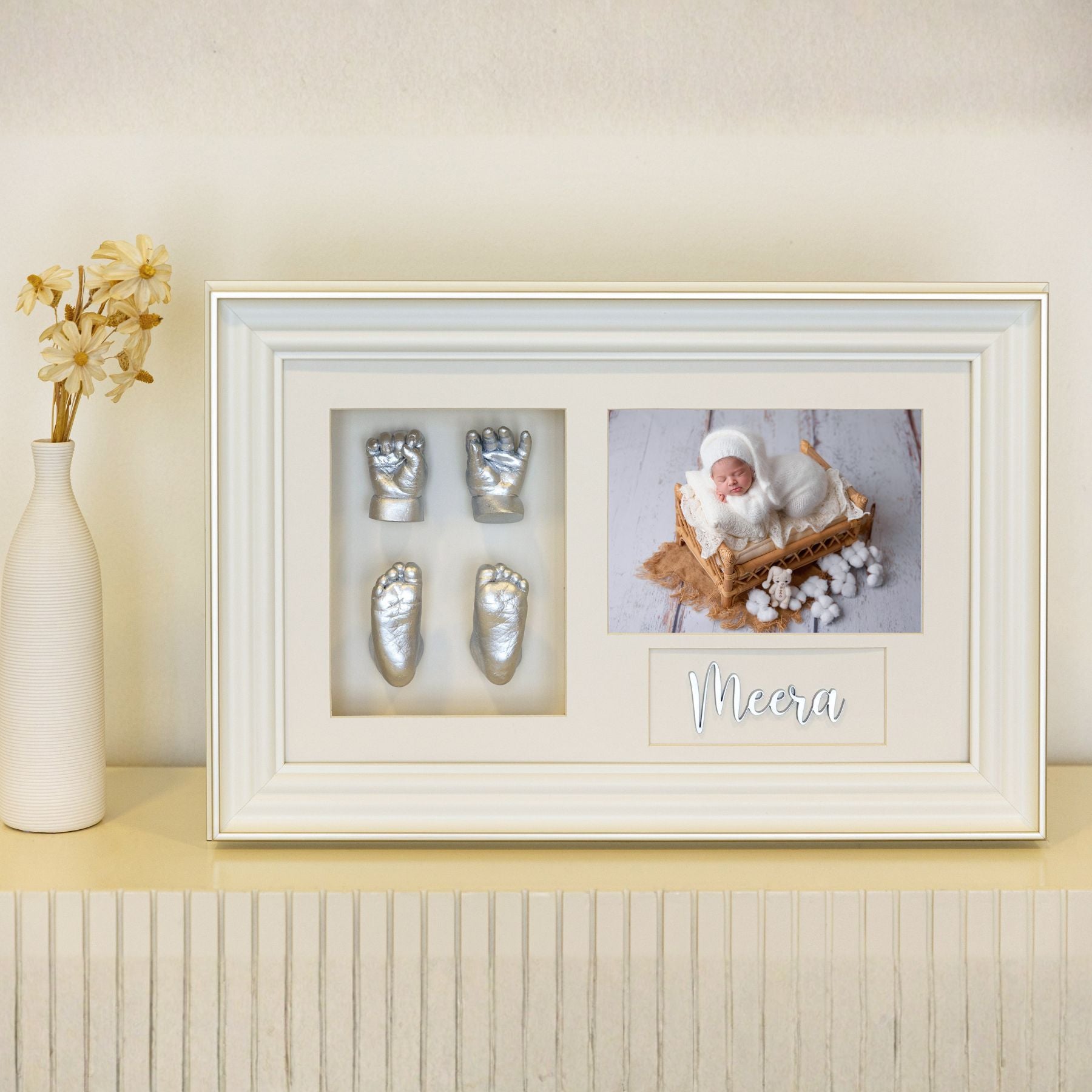 Celebrate your little one’s earliest days with a Life Casting Session by First Impression Artwork, Dubai’s leading keepsake studio. This exquisite Double Window Frame pairs a detailed 3D cast of your baby’s tiny hand or foot with a photograph — capturing both touch and memory in one timeless display.