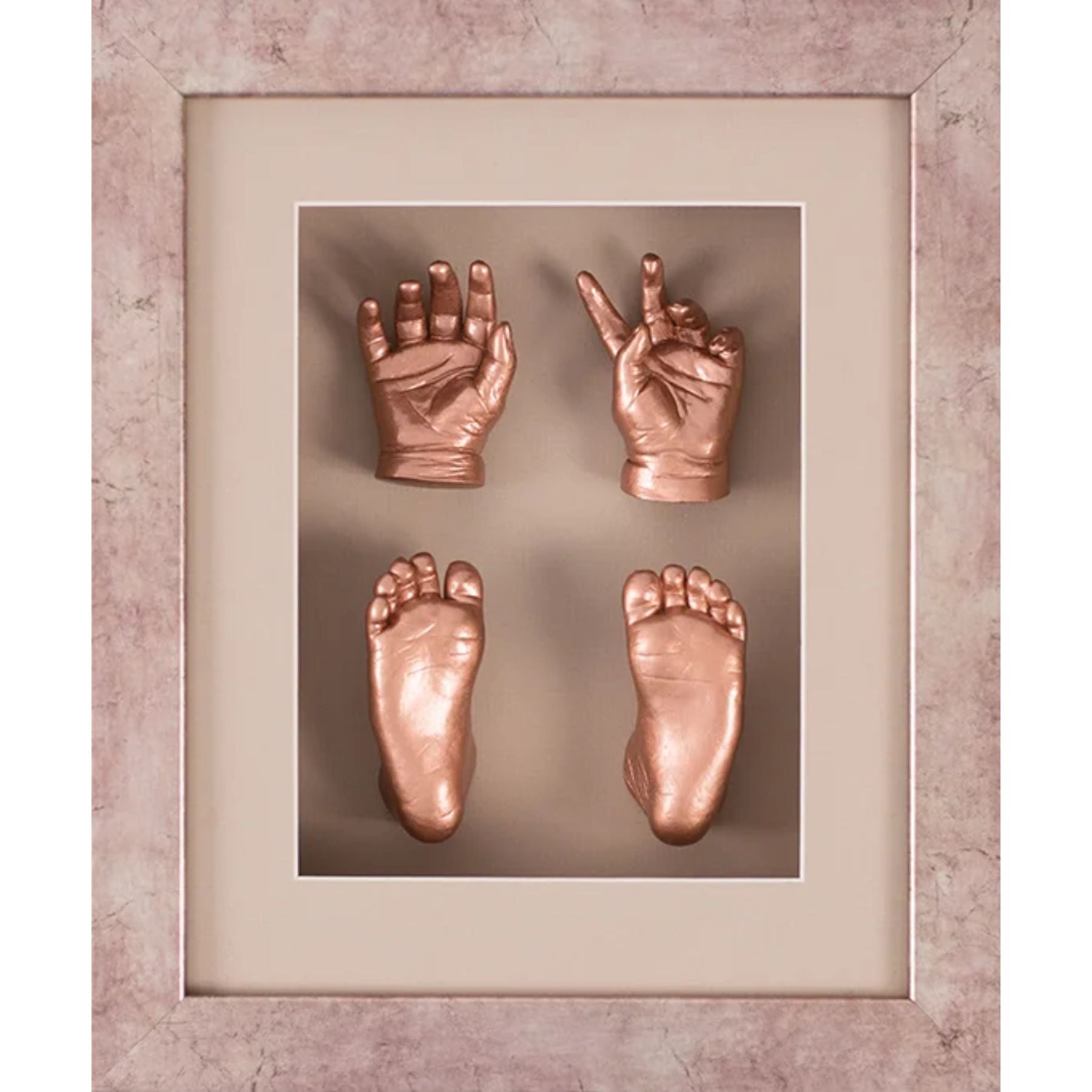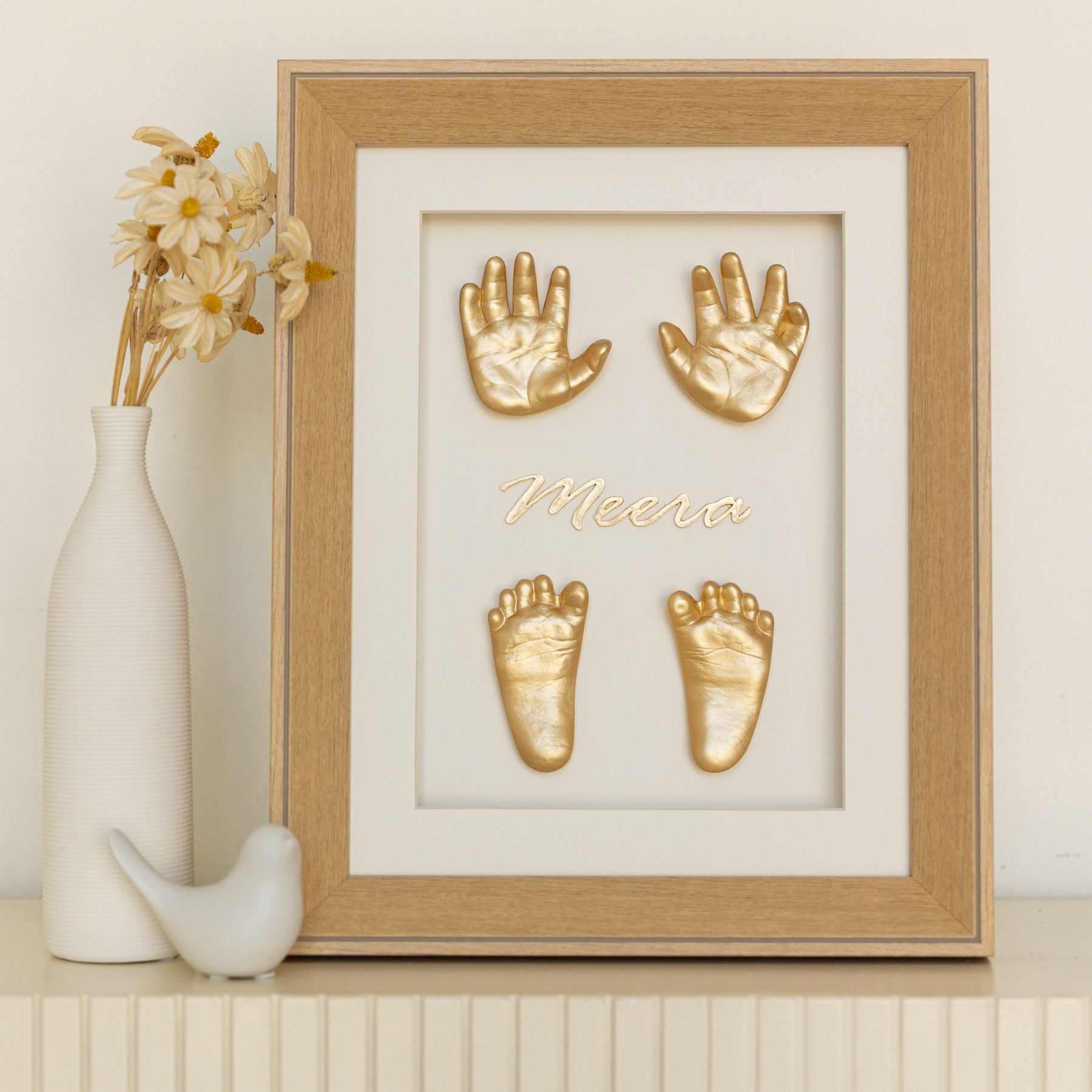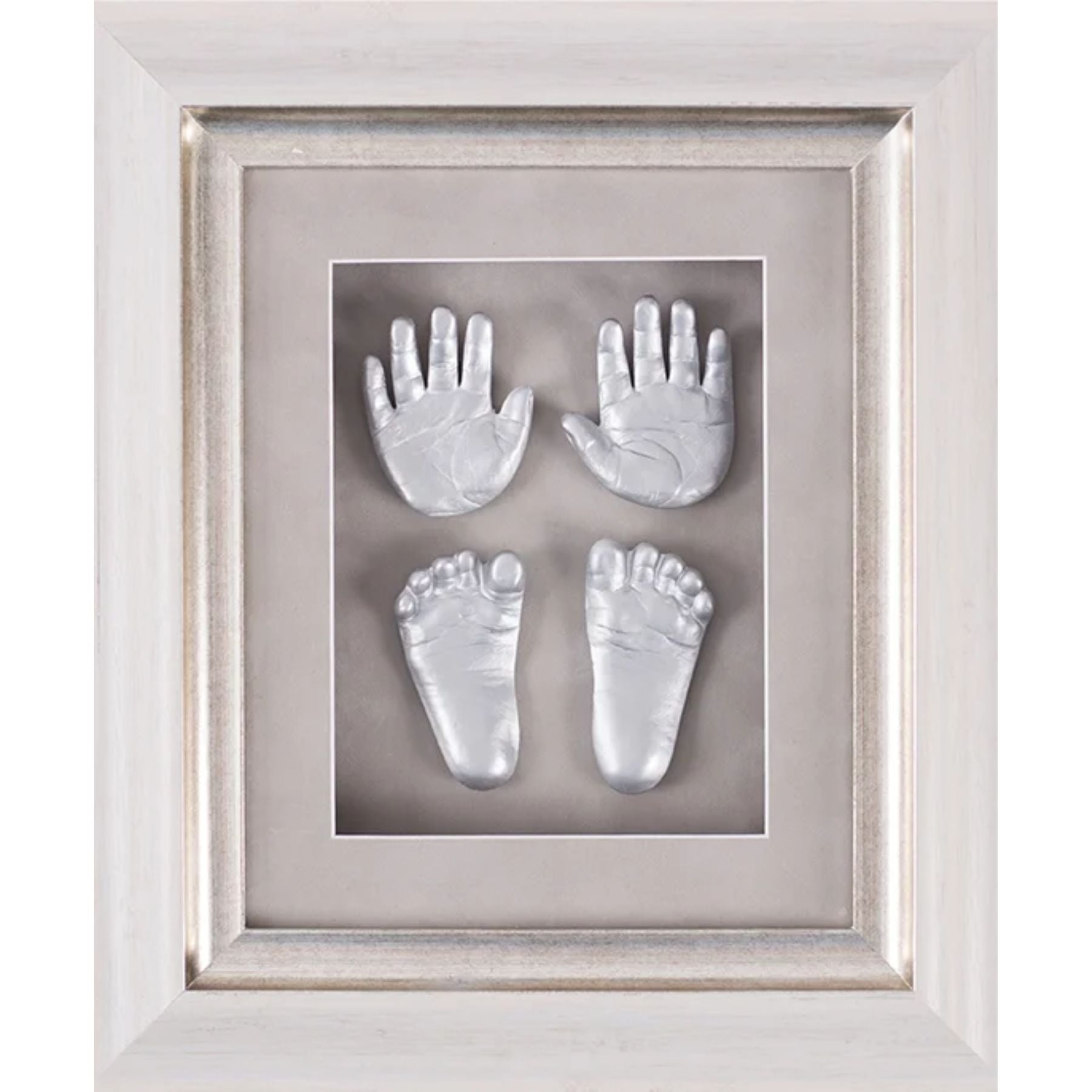 Framed metallic baby hand and footprints on a white background with decorative elements.